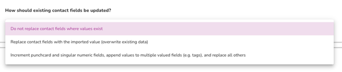 - Update Preferences: Specify how you want to update existing contact fields. You can choose not to overwrite existing data, replace fields with new values if not empty, or increment loyalty points without overwriting other values.