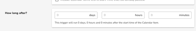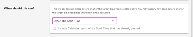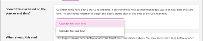 Calendar items have a start and end time (end time matters if you trigger on “End Time”)