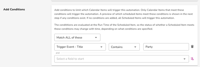 Important: Conditions are checked at the scheduled run time, not when the calendar item is created. So if the event changes later (time, status, etc.), the trigger may behave differently.