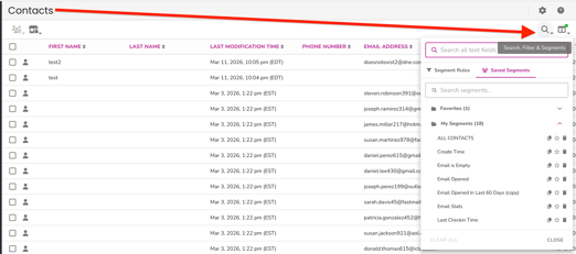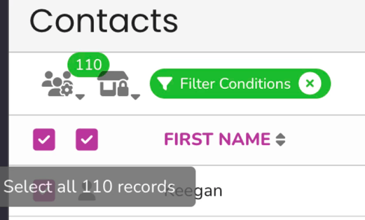 - Select all contacts. Click the first checkbox to select the contacts on the current page. Then click the second checkbox to select all contacts in the segment across every page.