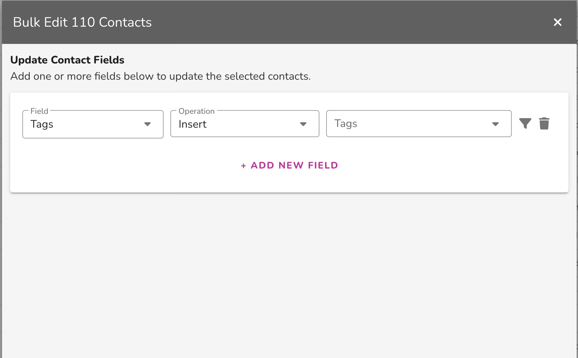 - Choose the fields to update. In the Bulk Edit window, choose the field, operation, and value you want to apply to all selected contacts. Use + Add New Field if you need to update more than one field in the same bulk update.