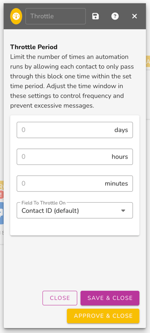 The Throttle block ensures each contact only passes through that point once within the time window you set, regardless of how many times the automation trigger fires.