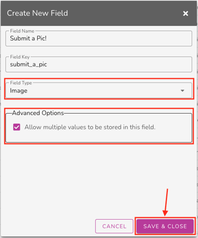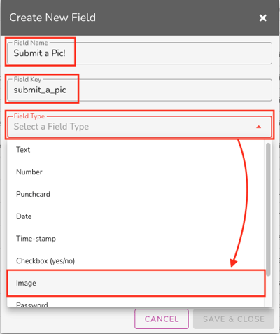 - It will ask you to Name the field. The ‘Field Key’ will populate automatically. Then you will need to select the ‘Field Type’ to be an image.